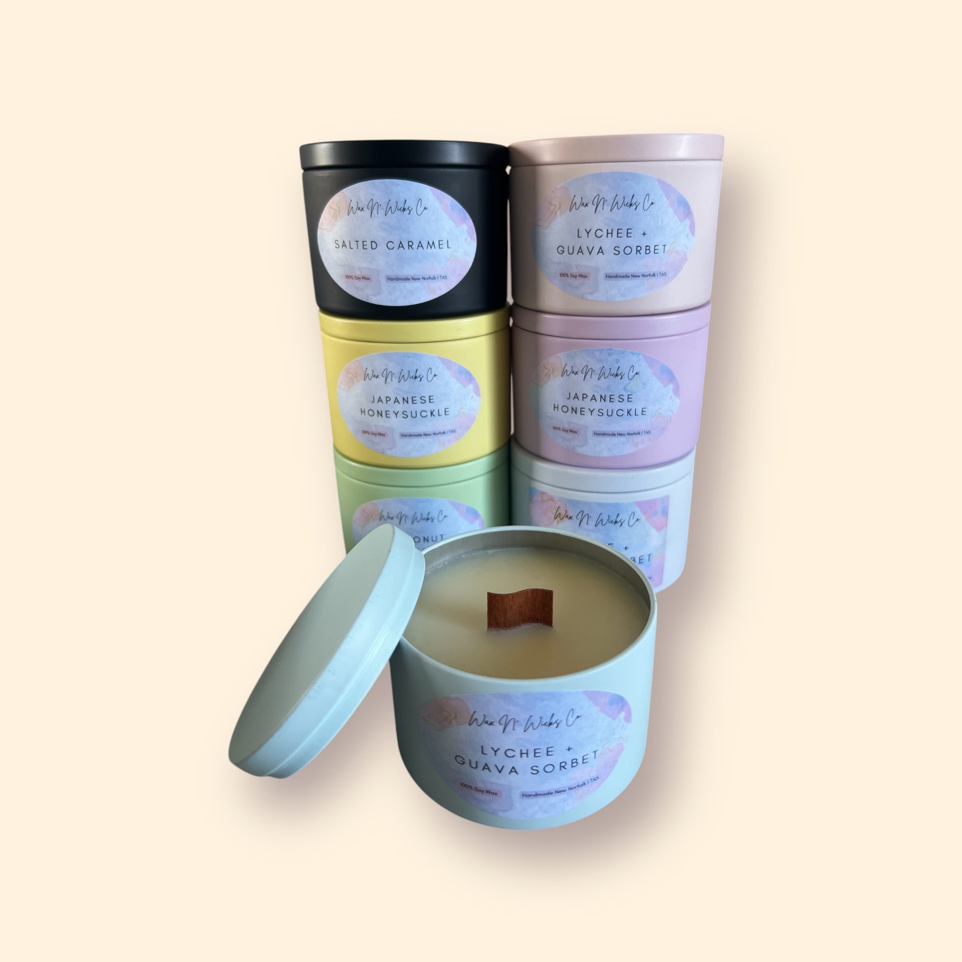 Take your favourite scents wherever you go with our Tin Candle Collection. These compact soy candles are perfect for road trips, office spaces, or gifting. With an eco-friendly tin and a soothing wooden wick, these travel companions ensure cosy vibes anywhere.
